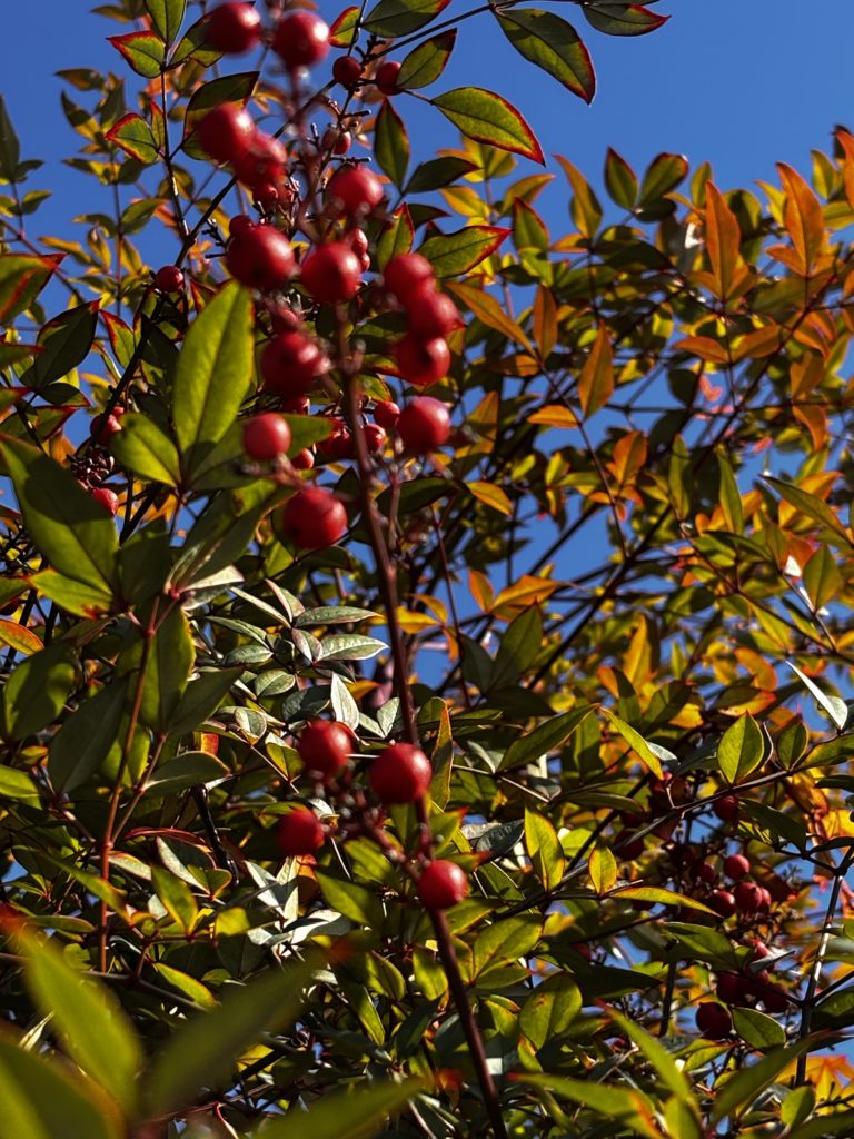 青いお空に色づいた木々、